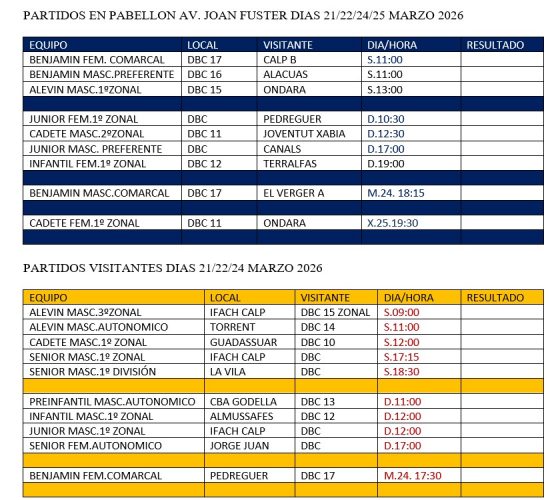 Partidos de baloncesto programados para los días 21,22,24 y 25 de Marzo del 2026.